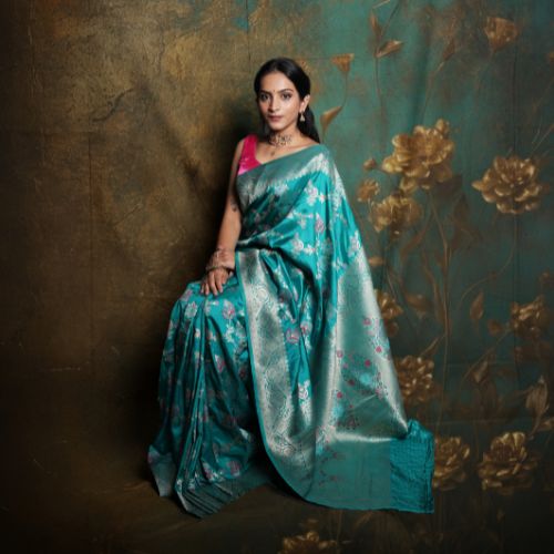 A masterpiece of craftsmanship, this Pure Banarasi Meenakari Saree showcases the rich heritage of Banaras with its intricate handwoven designs. Adorned with delicate Meenakari work, vibrant floral and paisley motifs come to life through fine resham and zari detailing. Crafted from luxurious silk, this saree has a rich texture, making it perfect for weddings, festive occasions, and grand celebrations. Its timeless elegance and royal appeal make it a treasured addition to any wardrobe.