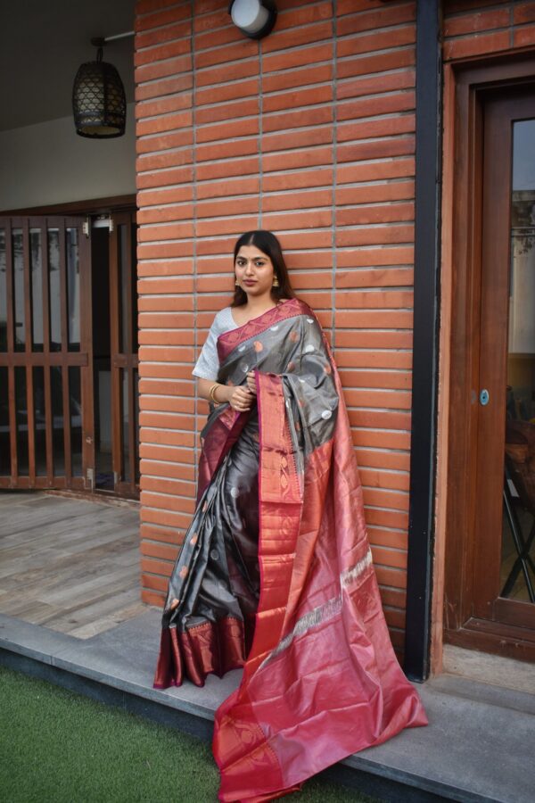 A blend of luxury and tradition, this Pure Tissue Kanchivaram saree is crafted from the finest silk tissue, giving it a luminous, sheer finish. The saree features intricate zari weaving, elegant motifs, and a grand pallu, adding a regal touch. Lightweight yet opulent, it is perfect for weddings, festive occasions, and grand celebrations.